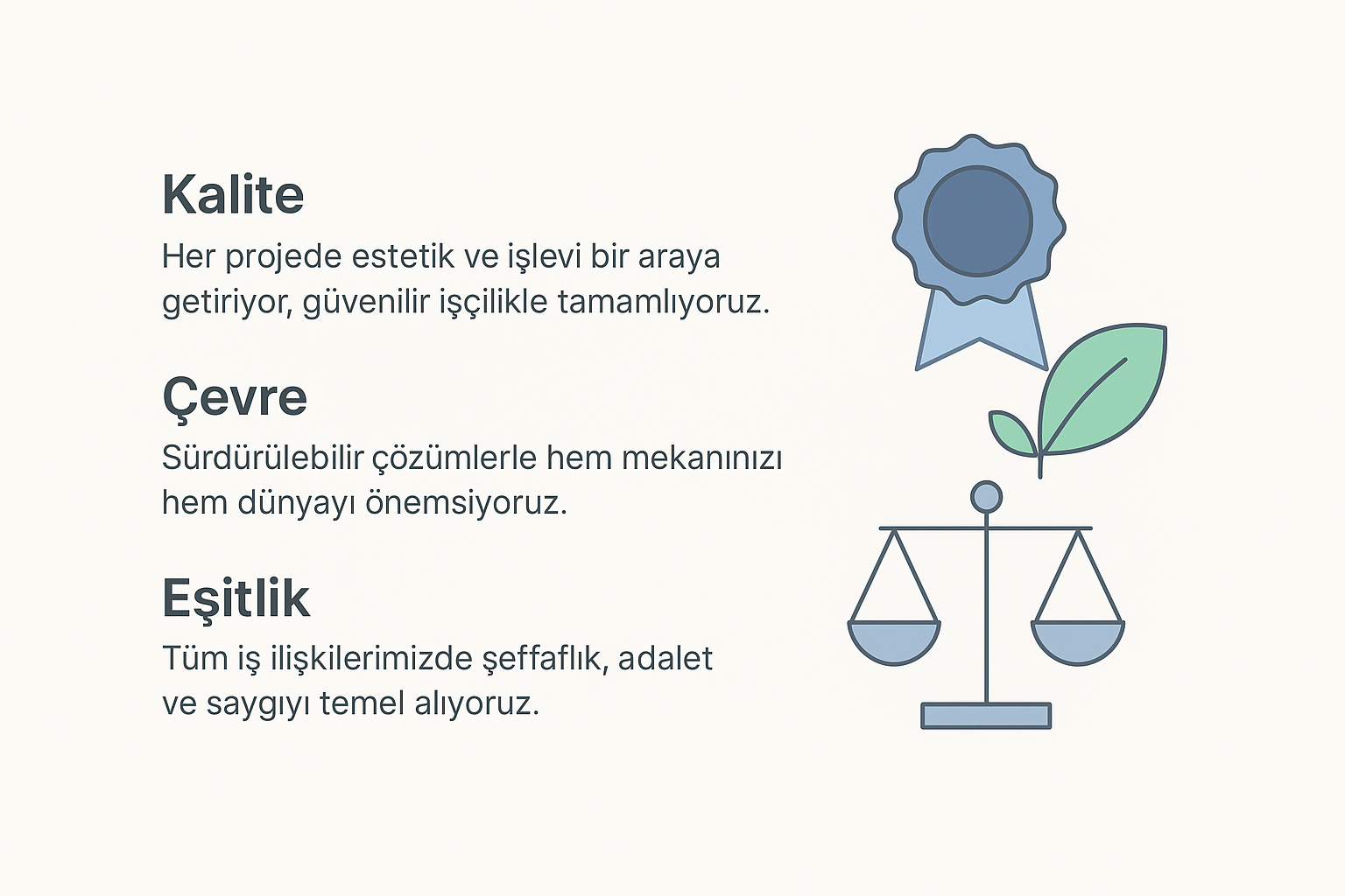 Kalite, güven ve müşteri memnuniyeti bizim önceliğimiz. Her projede estetik ve işlevi bir araya getiriyoruz.